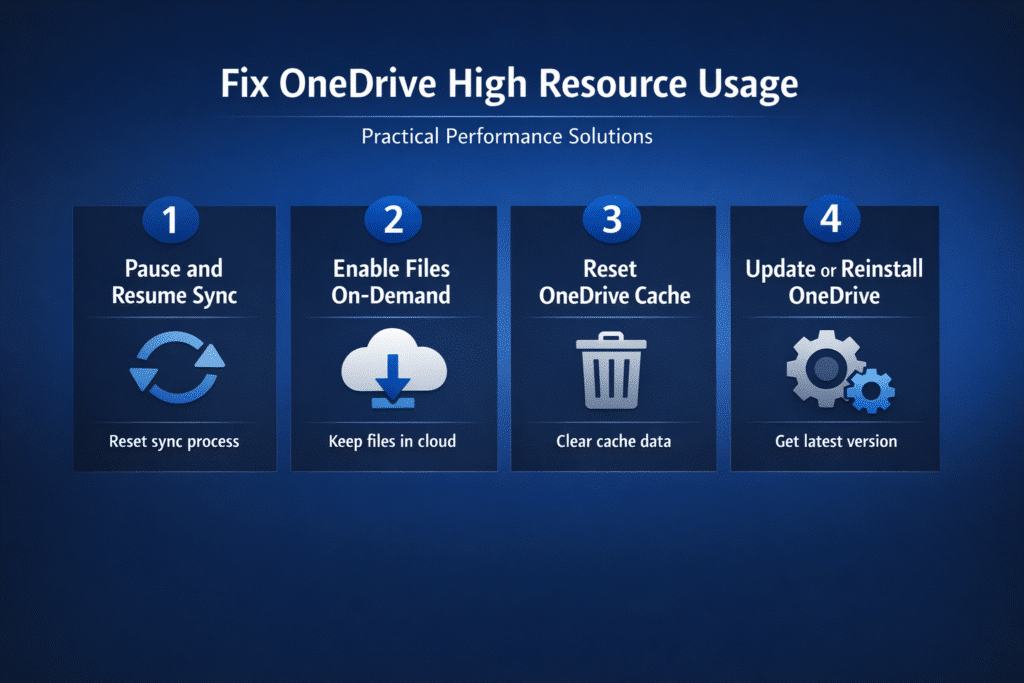 OneDrive uses excessive CPU when syncing large numbers of files, rebuilding its cache index, or processing file conflicts across multiple devices simultaneously in background. Corrupted cache files and outdated software versions also cause OneDrive to consume abnormal CPU resources that persist until you reset or update the application. Enabling Files On-Demand and limiting sync folders are the two most effective solutions for reducing persistent high CPU usage from OneDrive processes.