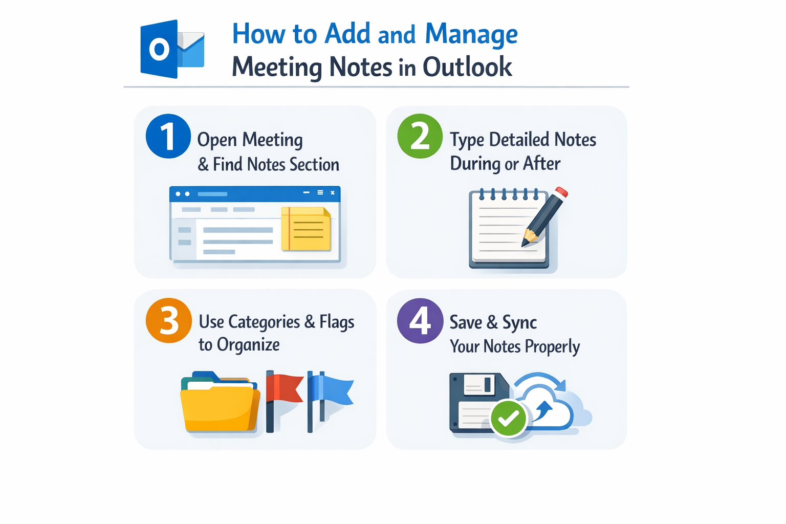 We will add comprehensive meeting notes directly within Outlook using the built-in notes functionality available in calendar entries. You will learn to create detailed meeting records that include discussion points, action items, attendee feedback, and follow-up tasks all within your existing Outlook environment. The solution covers both desktop and web versions of Outlook, ensuring you can add notes regardless of which platform you are using. Prerequisites include having an active Microsoft 365 or Outlook account with calendar access permissions.