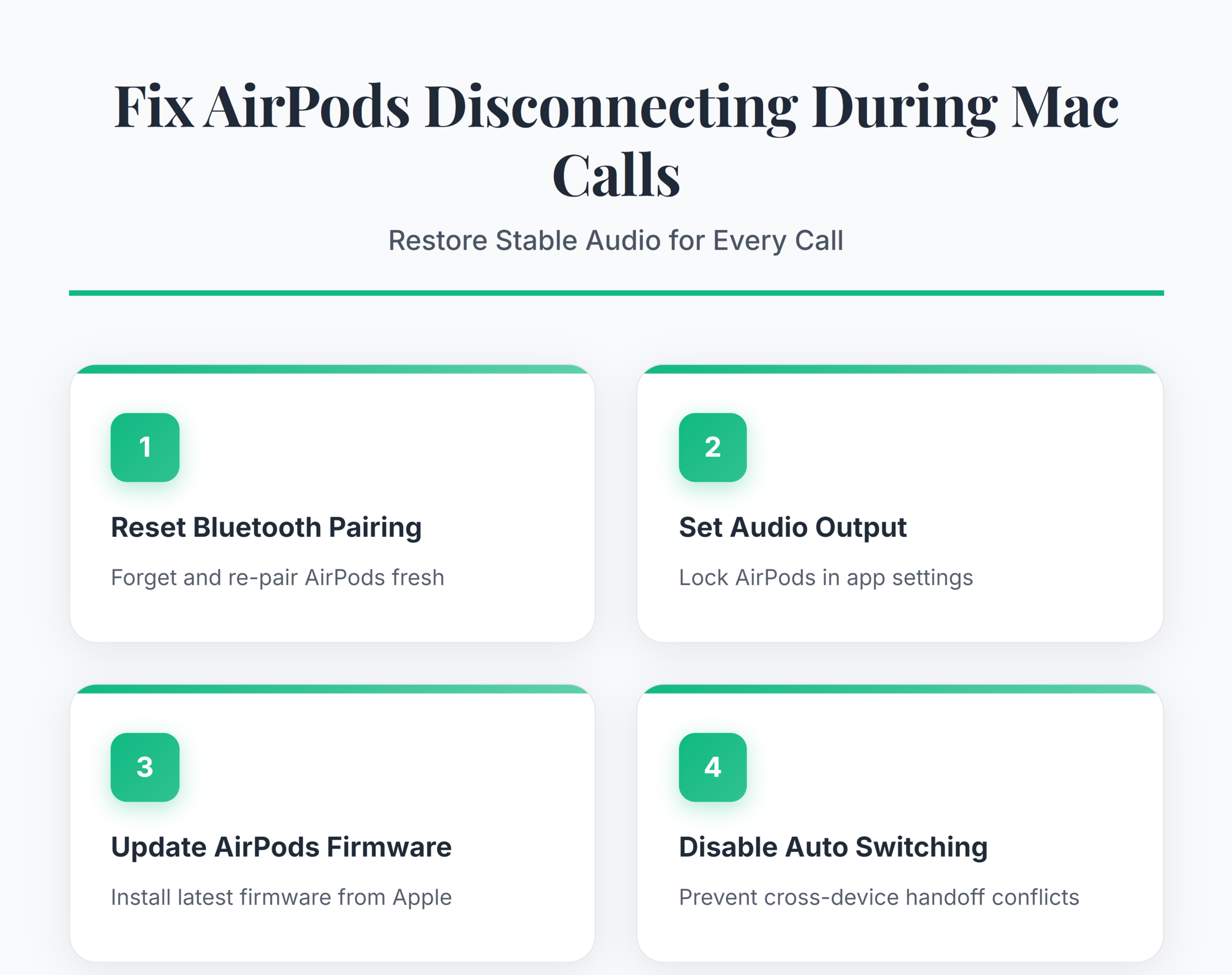 A clean Bluetooth re-pair combined with explicit audio device settings in your calling application resolves most AirPods disconnection issues on Mac. Run through the firmware update check and disable automatic switching to keep your connection stable across long meetings and conference calls.