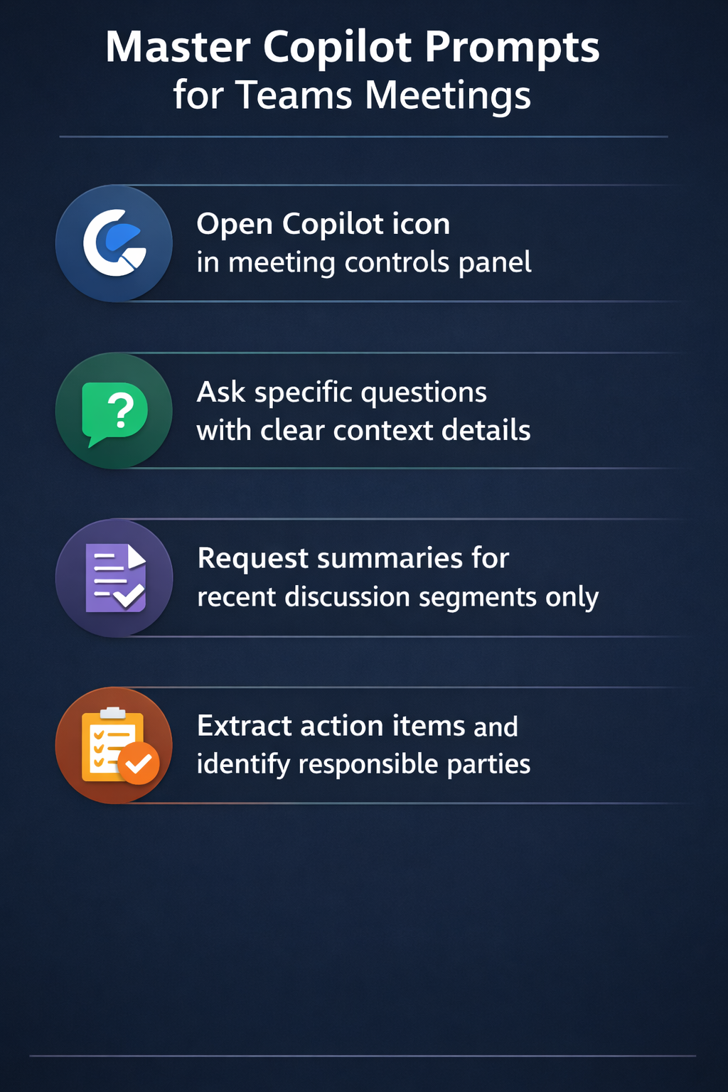 Expert Tip: Copilot works best when meeting transcripts are clear and participants speak distinctly, so encourage your team to use quality microphones and minimize background noise for optimal AI performance.