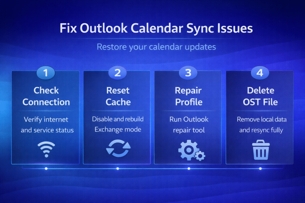 Outlook calendar not updating or loading disrupts scheduling across your entire organization, but the troubleshooting steps outlined in this article resolve the most common causes quickly. Start with simple connectivity and service health checks before progressing to cached Exchange mode resets, Outlook profile repairs, and manual OST file deletion for persistent issues. Bookmark this article for future reference, and consider sharing it with colleagues who experience similar Outlook calendar sync issues within your Microsoft 365 environment regularly.