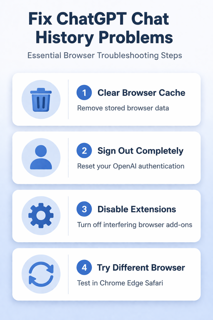 ChatGPT typically fails to show chat history due to browser cache problems, expired authentication tokens, or temporary server sync issues. Clear your browser data, sign out and back in, or refresh the page to restore access to your conversations.
