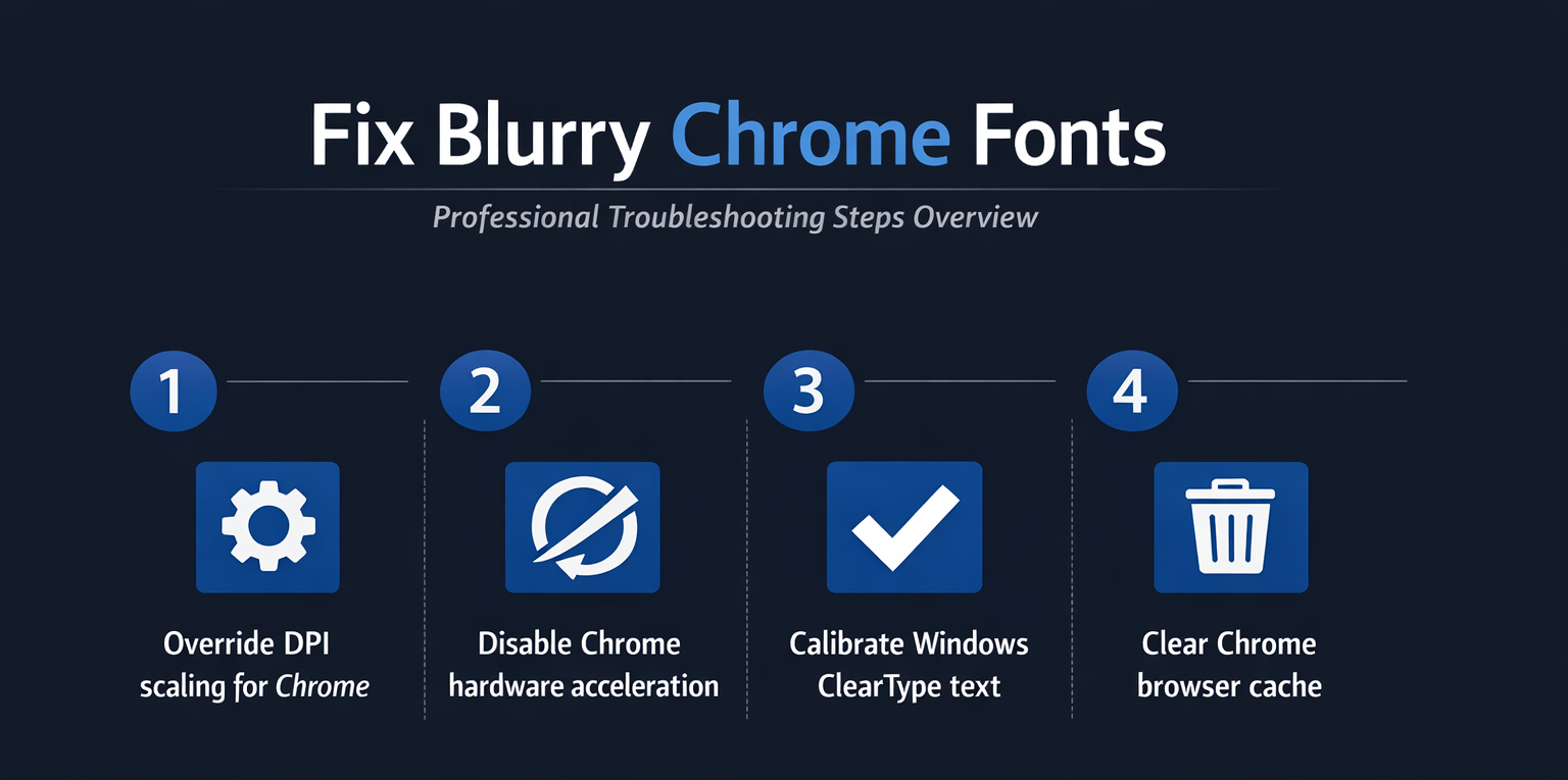 Blurry or fuzzy fonts in Chrome typically result from display scaling conflicts, hardware acceleration issues, outdated ClearType calibration, or corrupted cache data that interferes with proper rendering. Working through each troubleshooting step in this article systematically ensures you identify and resolve the specific cause affecting your particular system configuration and display setup. Starting with the DPI scaling override and hardware acceleration toggle addresses the two most common root causes, while ClearType calibration and cache clearing handle the remaining edge cases effectively.