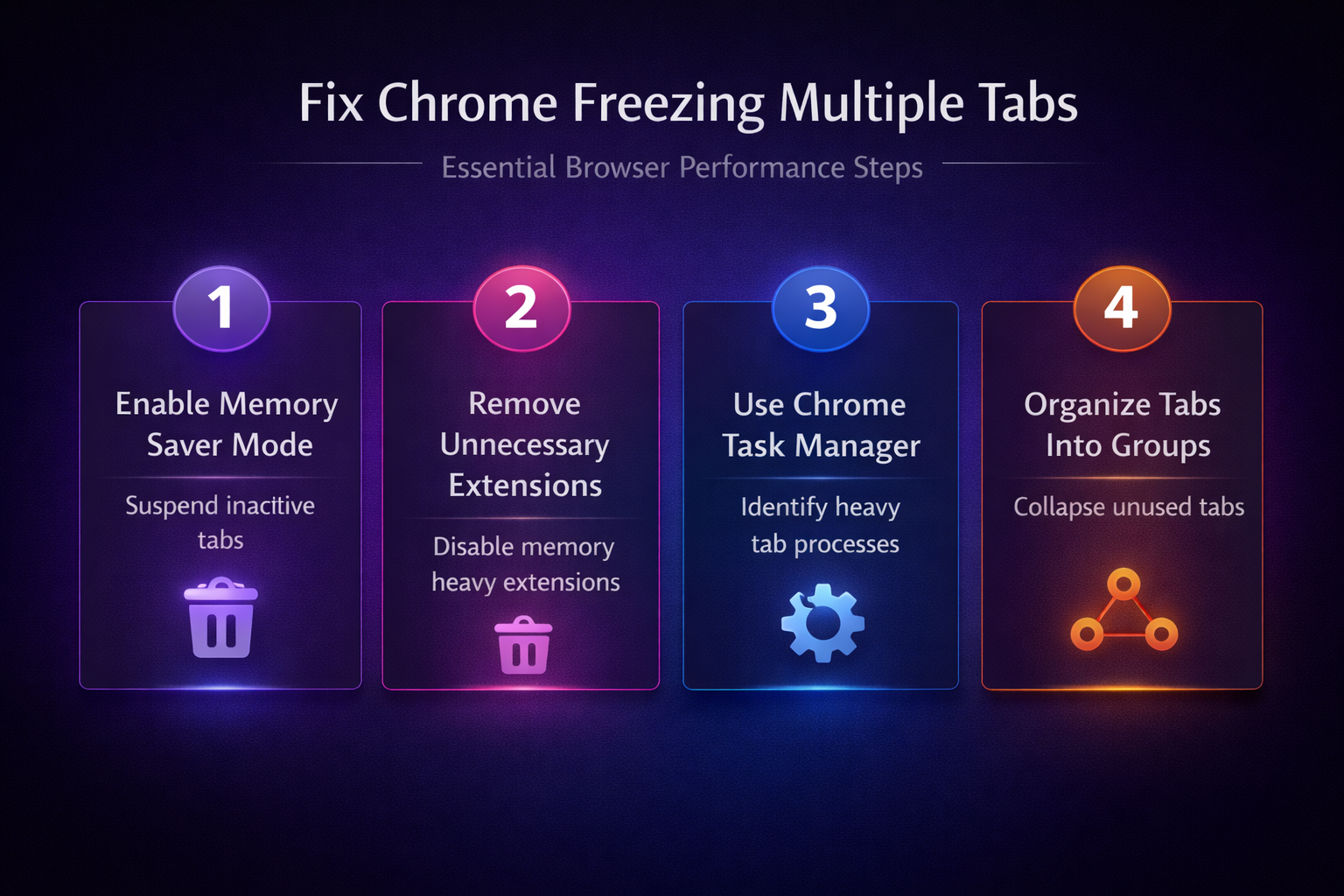 Preventing Chrome from freezing when opening too many tabs requires a combination of enabling Memory Saver mode, regularly closing resource-heavy tabs through Task Manager, and removing unnecessary extensions from your browser. The most effective long-term strategy involves enabling both Memory Saver and hardware acceleration while organizing your active tabs into collapsible groups that reduce simultaneous resource consumption across your browsing session. These configuration changes together ensure that Chrome manages its memory allocation efficiently, even when you maintain dozens of open tabs for research, work, or personal browsing purposes.