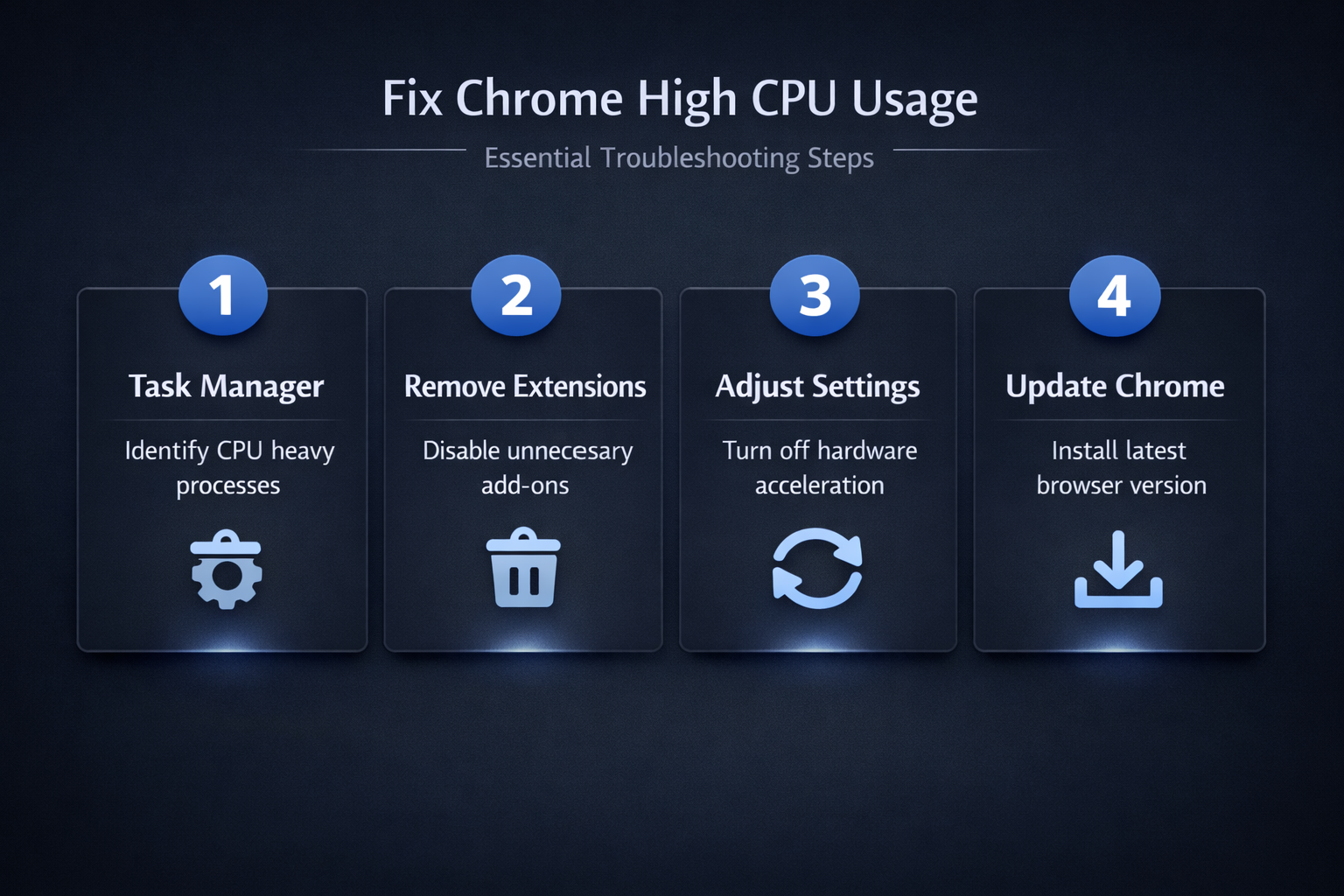 Fixing Chrome high CPU usage requires a systematic approach starting with the Chrome Task Manager to identify the specific processes consuming the most resources on your particular system. Removing unnecessary extensions, stopping background processes, adjusting hardware acceleration, and keeping Chrome updated are the most effective solutions that consistently produce noticeable performance improvements across different hardware. Apply these methods in sequence and monitor your CPU usage after each change to address broader Windows performance slowdowns on your system and restore smooth responsive operation.