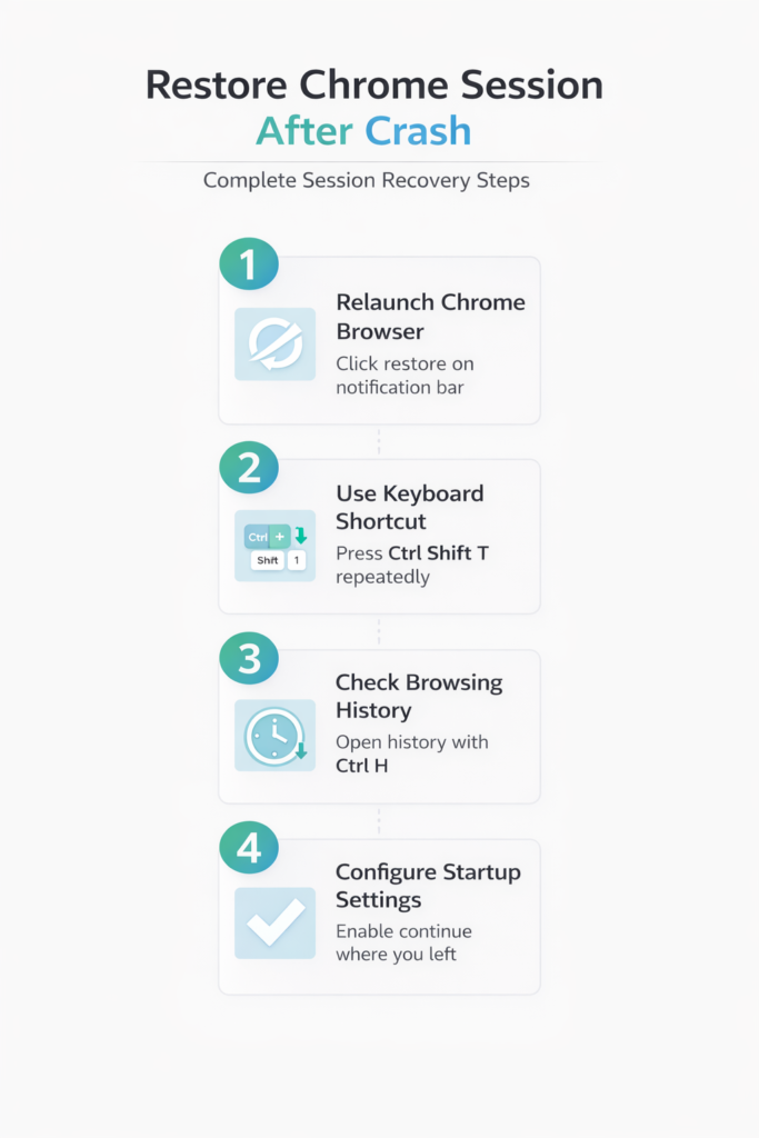 Relaunch Chrome after the crash and look for the automatic session restore notification bar that typically appears at the top of the browser window asking you to restore tabs. If the prompt does not appear, press Ctrl+Shift+T repeatedly to reopen recently closed tabs, or navigate to your browsing history using Ctrl+H to find pages manually. Enabling the Continue where you left off startup setting prevents this issue from occurring again by automatically restoring your previous session on every browser launch.