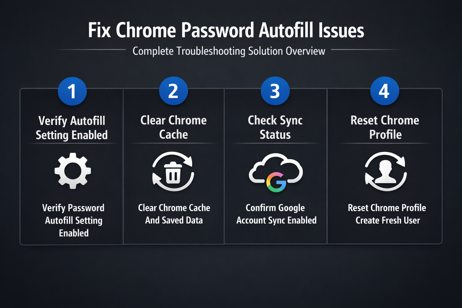 Chrome saved passwords not showing in autofill prevents you from logging into websites quickly, forcing you to retrieve credentials manually every time you visit a previously saved login page. Google Password Manager stores your encrypted credentials and delivers them through the autofill dropdown, but several common settings changes, browser updates, and sync disruptions can silently disable this essential convenience feature. This article walks you through every proven troubleshooting step to restore Chrome password autofill functionality, covering settings verification, cache clearing, sync repair, profile recovery, and extension conflict resolution on your computer.