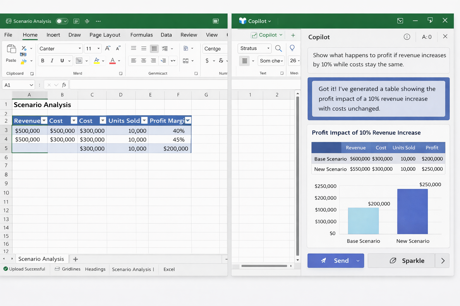 - Change output format — Request that Copilot “Convert this scenario table into a chart showing profit trends across all three scenarios” so you can present findings visually to stakeholders who prefer graphical summaries over raw numerical tables