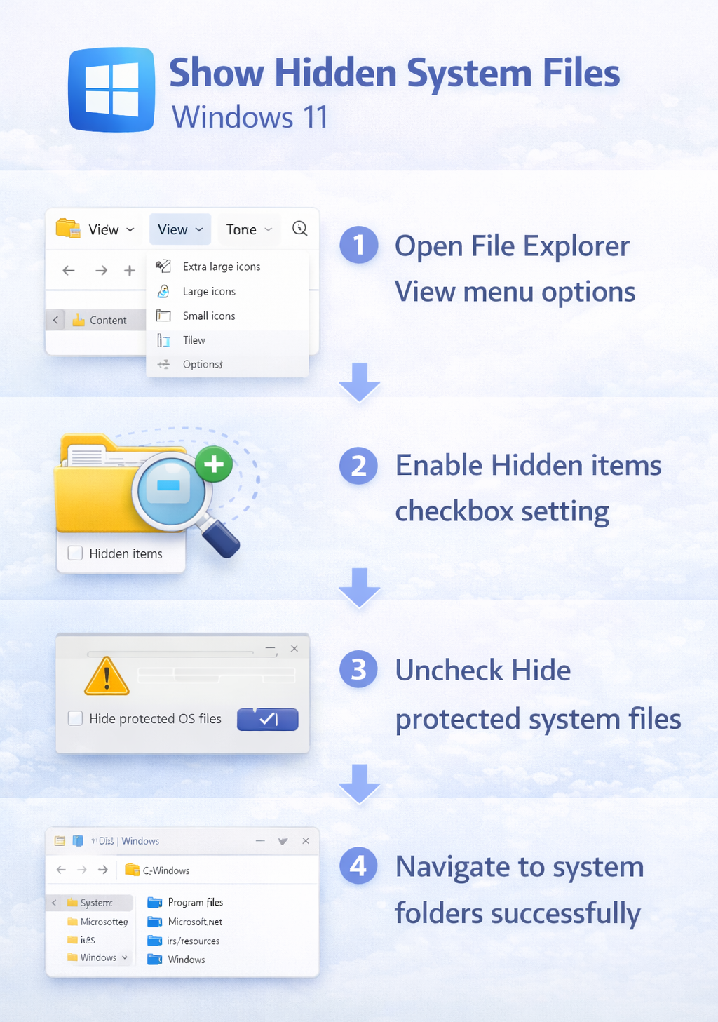 We’ll show how to make hidden files visible in Windows 11 through File Explorer settings, enabling you to access system files and folders that are normally concealed from view. You will learn multiple methods for revealing these files, understand the differences between hidden and system file attributes, and discover how to toggle visibility settings based on your current needs. The process requires no special software or administrative privileges for basic hidden file viewing, though accessing certain system folders may require elevated permissions.