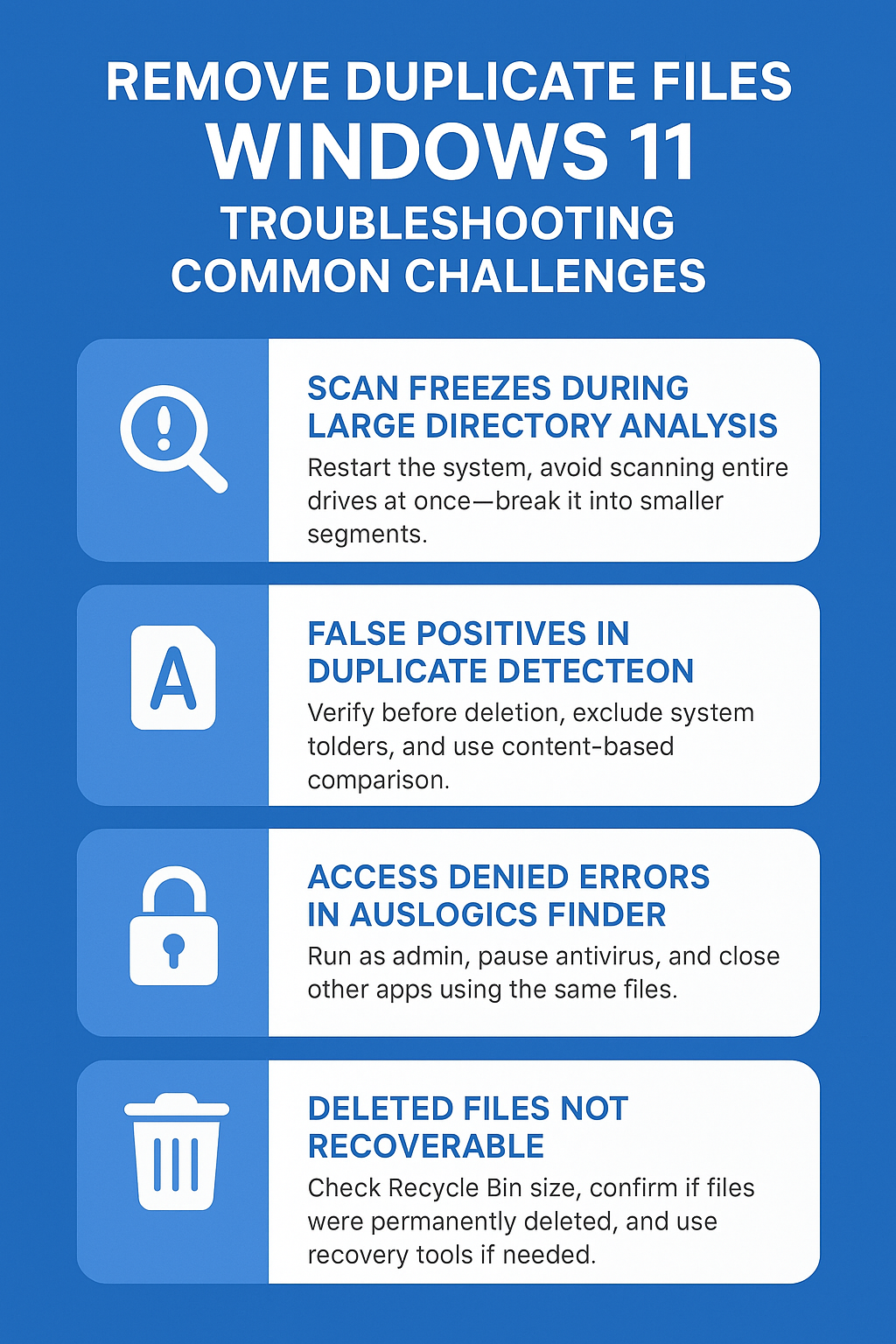 - False positives identifying system files or important documents as duplicates: Always verify file locations and purposes before deletion, exclude Windows system directories from scans, and use content comparison rather than name-only matching to reduce incorrect duplicate identification.