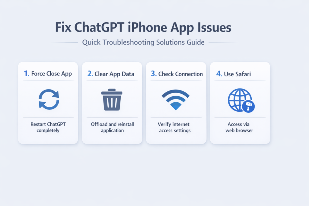 Most ChatGPT iPhone issues trace back to app cache problems or network configuration conflicts. Start with the simplest fix — force closing and restarting the app — before moving to more involved solutions like network resets.