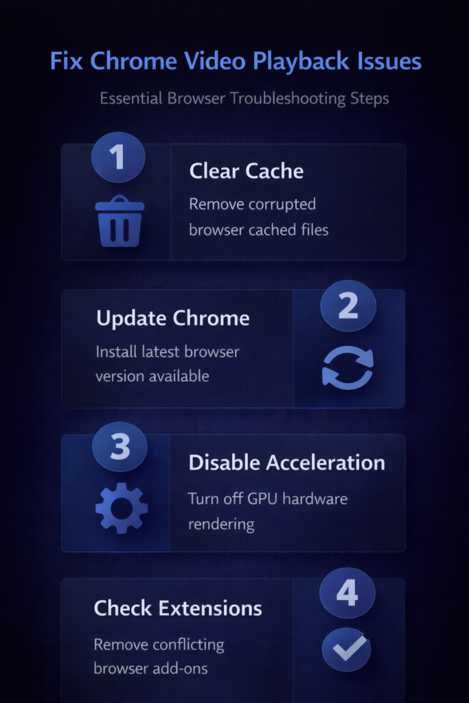 Chrome video playback failures typically result from outdated browser versions, corrupted cache files, incompatible extensions, or disabled JavaScript settings that prevent media elements from functioning properly. Additionally, hardware acceleration conflicts with older GPU drivers and restrictive site permissions can block video rendering even when your internet connection works perfectly fine. Identifying the specific cause requires systematic troubleshooting, starting with the simplest solutions like clearing cache before moving to more advanced configuration changes in browser settings.