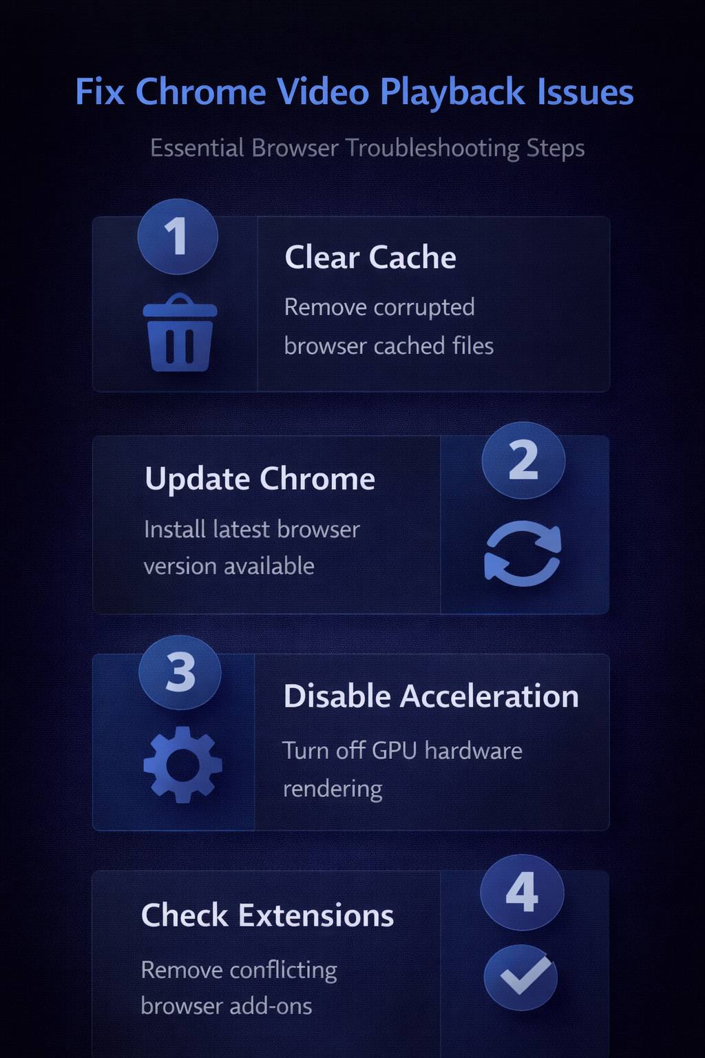 Fixing Chrome video playback problems requires a systematic approach that starts with basic checks like verifying your internet connection and clearing the browser cache before advancing to Chrome settings. Disabling hardware acceleration, removing problematic extensions, resetting Chrome to default values, and verifying site-specific media permissions address the vast majority of Google Chrome video issues users encounter. Following these steps in order ensures that you identify and resolve the root cause efficiently without making unnecessary changes to your browser configuration or system settings.