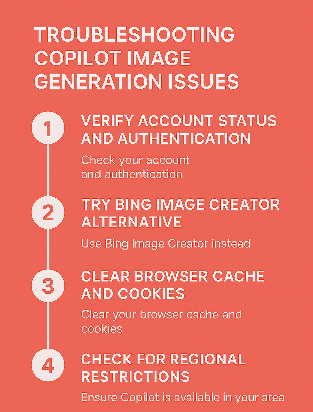 - Copilot displays “I can’t generate images” error message: This typically indicates either temporary service maintenance or account-level restrictions, so try switching to Bing Image Creator at bing.com/images/create using the same Microsoft account credentials.