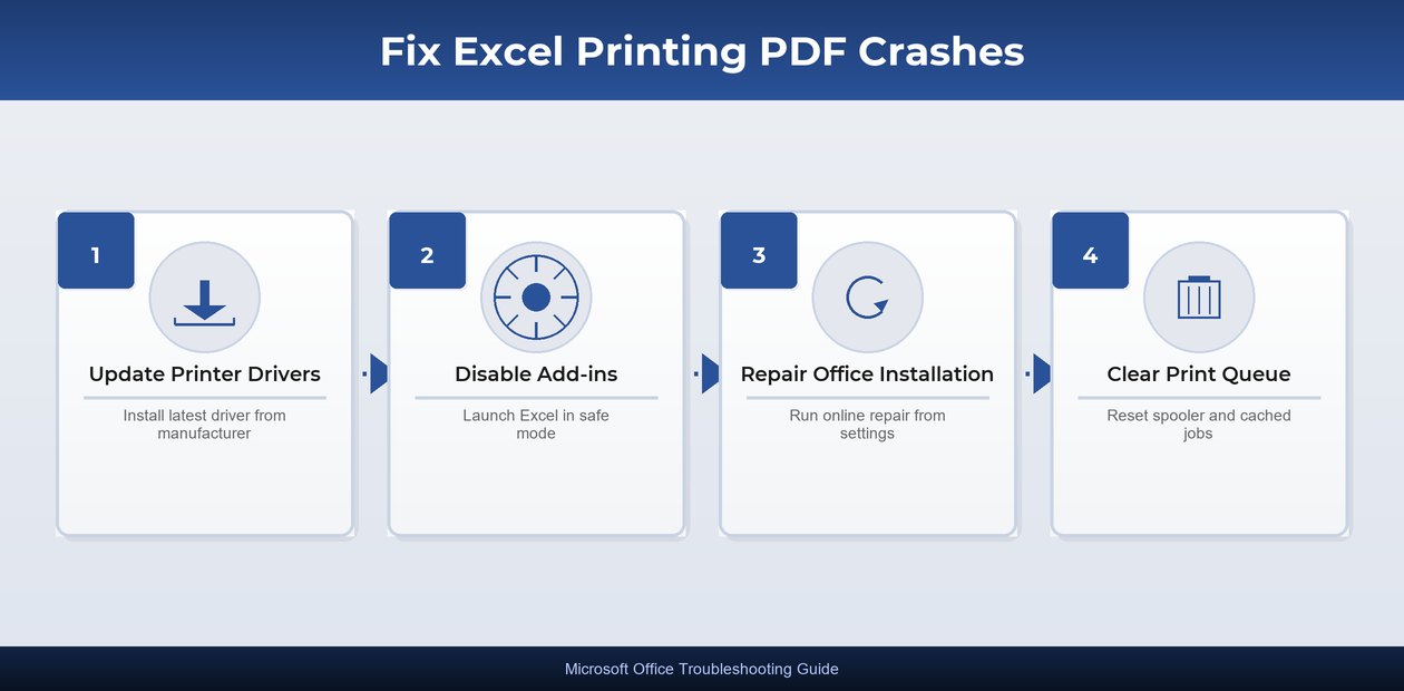 Resolving Excel crashes when opening large files requires a systematic approach that addresses add-in conflicts, graphics acceleration settings, file size optimization, and application integrity across your entire Office installation. Start by launching Excel in safe mode to quickly identify whether external components cause the problem, then work through hardware acceleration and file optimization steps until your large workbooks open reliably every time.