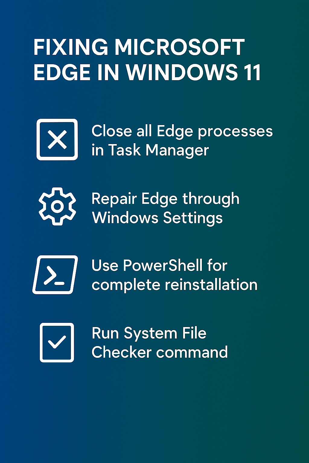 The process uses built-in tools such as PowerShell, Microsoft Edge’s repair options, and other native Windows utilities.