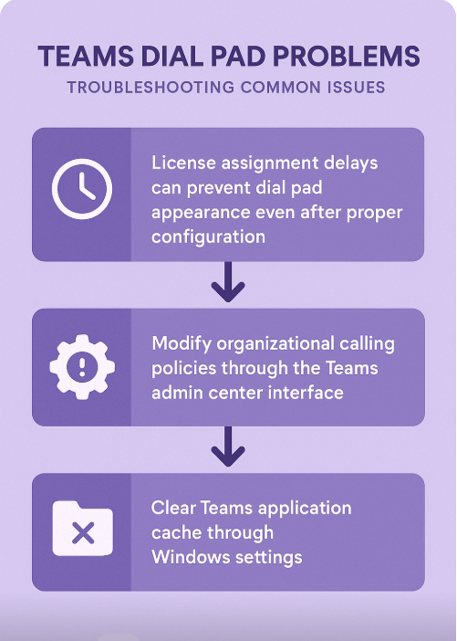 - Organizational calling policies may restrict dial pad functionality even with proper licensing, requiring administrators to review and modify Teams calling policies through the Teams admin center interface