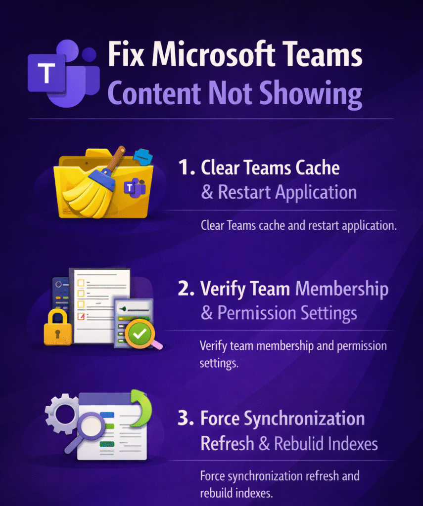 The workflow below addresses the most frequent scenarios where teams and their content become invisible to authorized users. You will clear problematic cache data, verify permission assignments, force synchronization refreshes, and validate tenant-level settings that control team discovery. This systematic approach resolves visibility issues without requiring administrator intervention in most cases.
