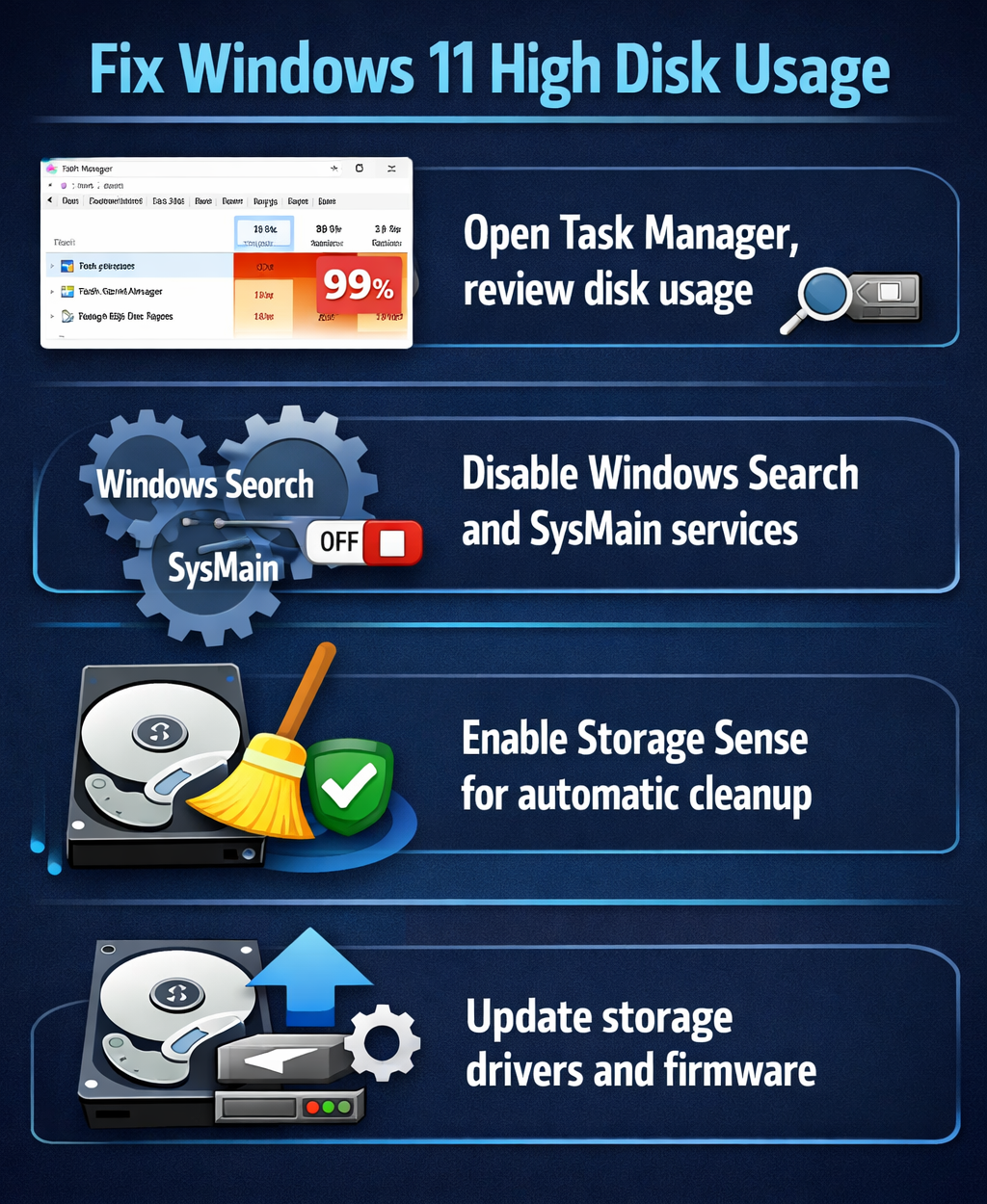 You will learn to disable problematic services, adjust system settings, update drivers, and configure Windows features that commonly trigger excessive disk activity without compromising system security or functionality.