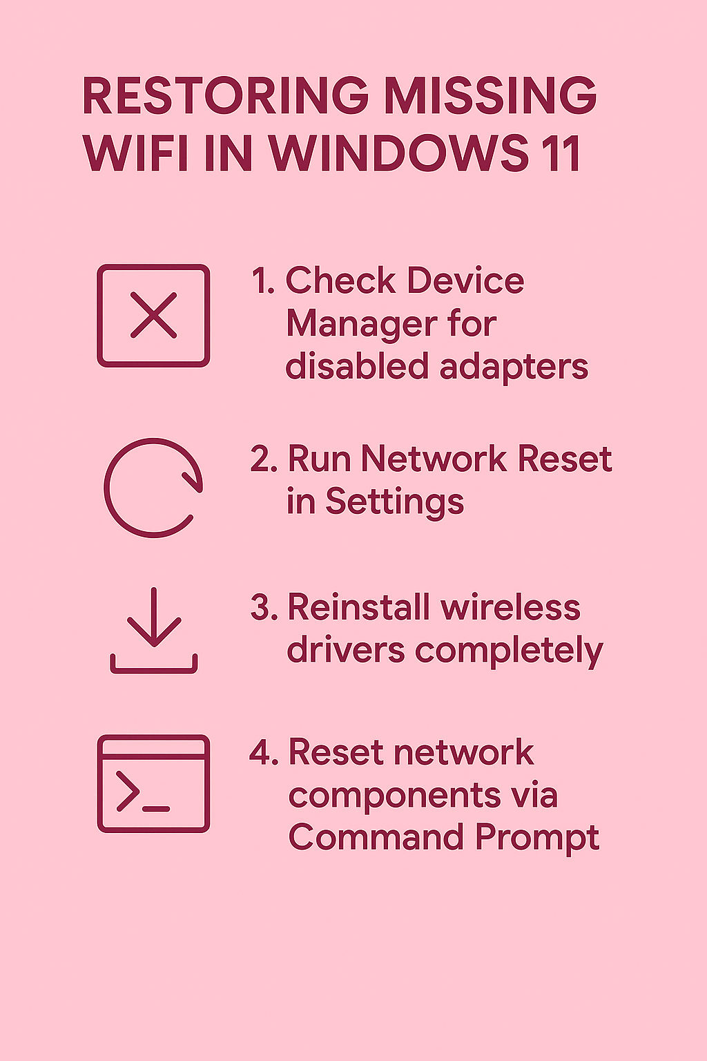 This step-by-step guide will walk you through restoring Wi-Fi functionality by addressing driver issues, detecting missing adapters, and repairing system configurations. You’ll work through scenarios ranging from the missing Wi-Fi toggle to a completely undetected adapter, ensuring your connection returns no matter what caused the failure. To complete the process, you’ll need administrator privileges and a working wireless card. The fixes use built-in tools such as Device Manager, Network Settings, Command Prompt, and Windows Update.