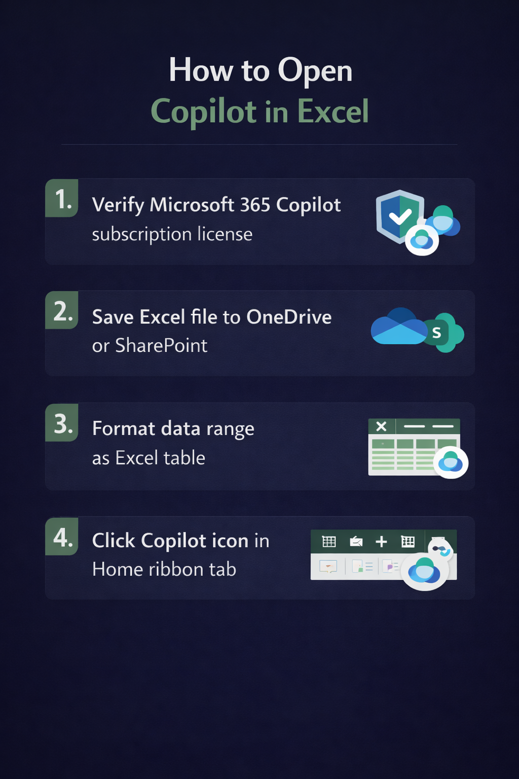 Important Tip: Copilot in Excel currently works only with files stored in OneDrive or SharePoint, so ensure your workbook is saved to a cloud location before attempting to access Copilot features.