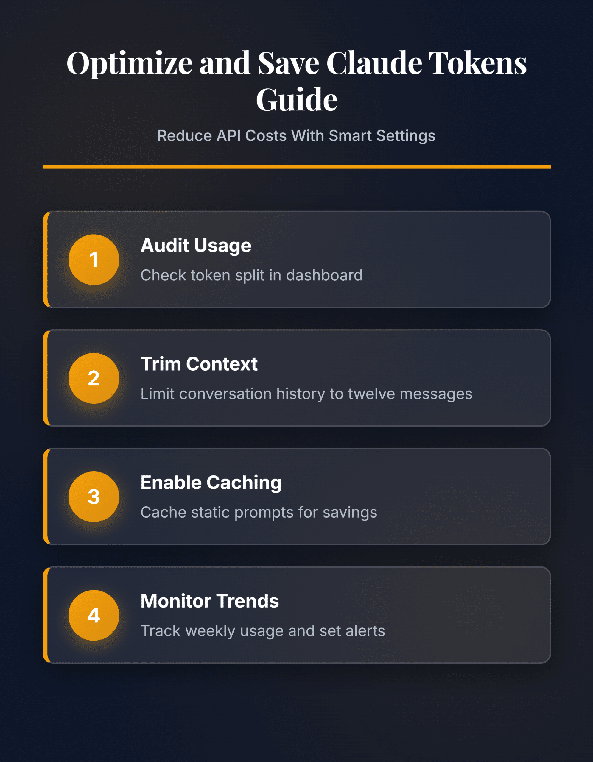 Open console.anthropic.com and navigate to Settings > Usage. This dashboard displays your daily and monthly token consumption broken down by model tier. Record your current spending pattern before making any changes so you have a clear baseline for measuring improvements after each optimization step.