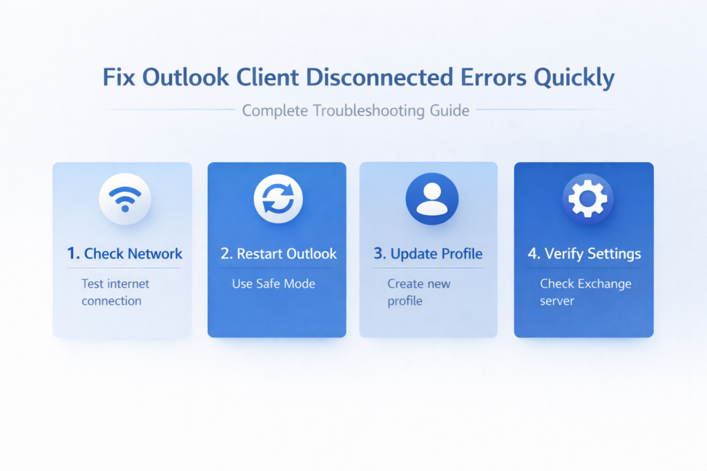 Outlook displays “client disconnected” when it loses communication with your email server due to network timeouts, authentication failures, or corrupted profile data. Network instability and incorrect server settings are the most common triggers for this error message.