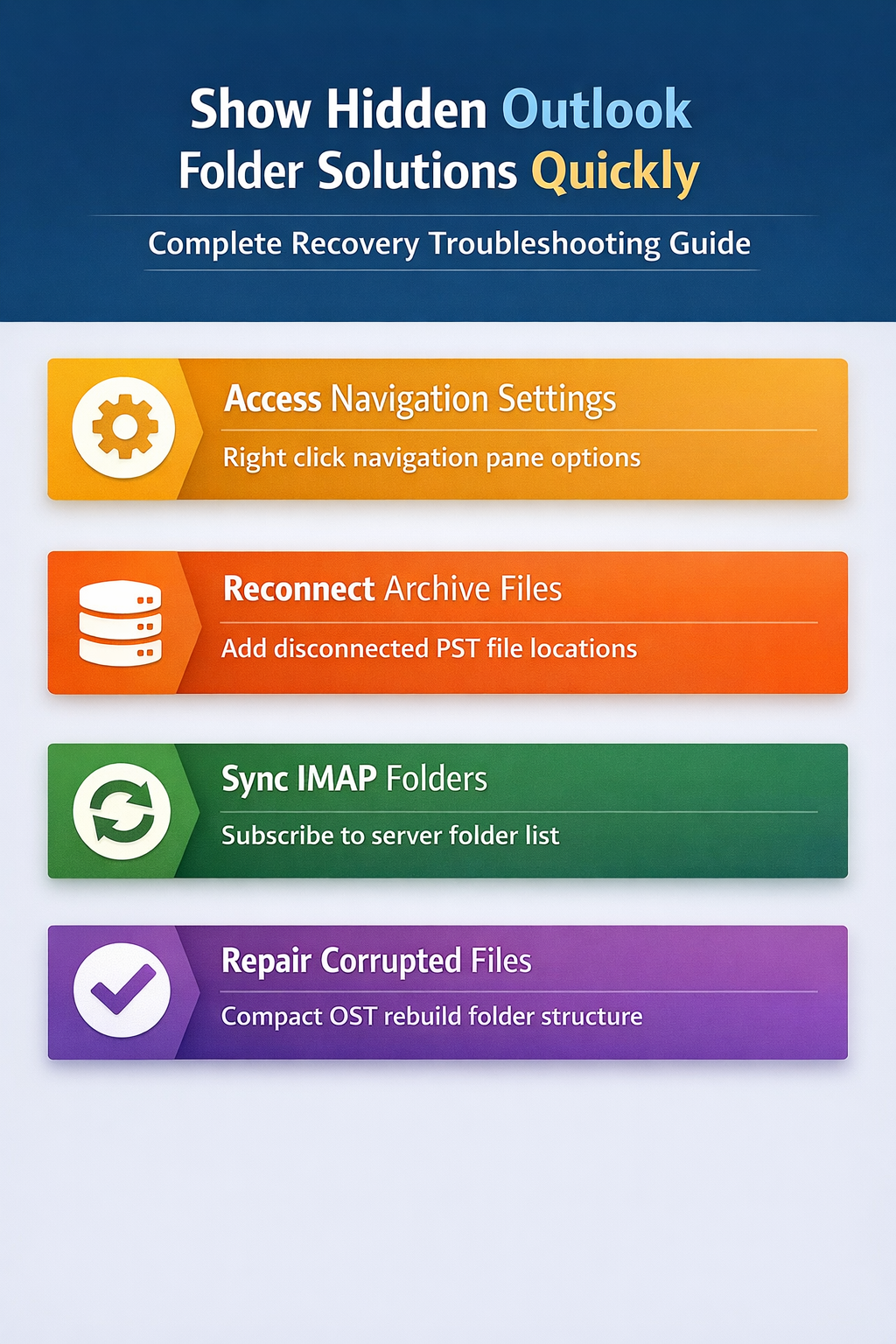 Outlook folders become hidden due to navigation pane view settings, disconnected archive files, IMAP sync failures, or corrupted OST files. Most cases result from accidental view changes or archive PST disconnection after system updates.