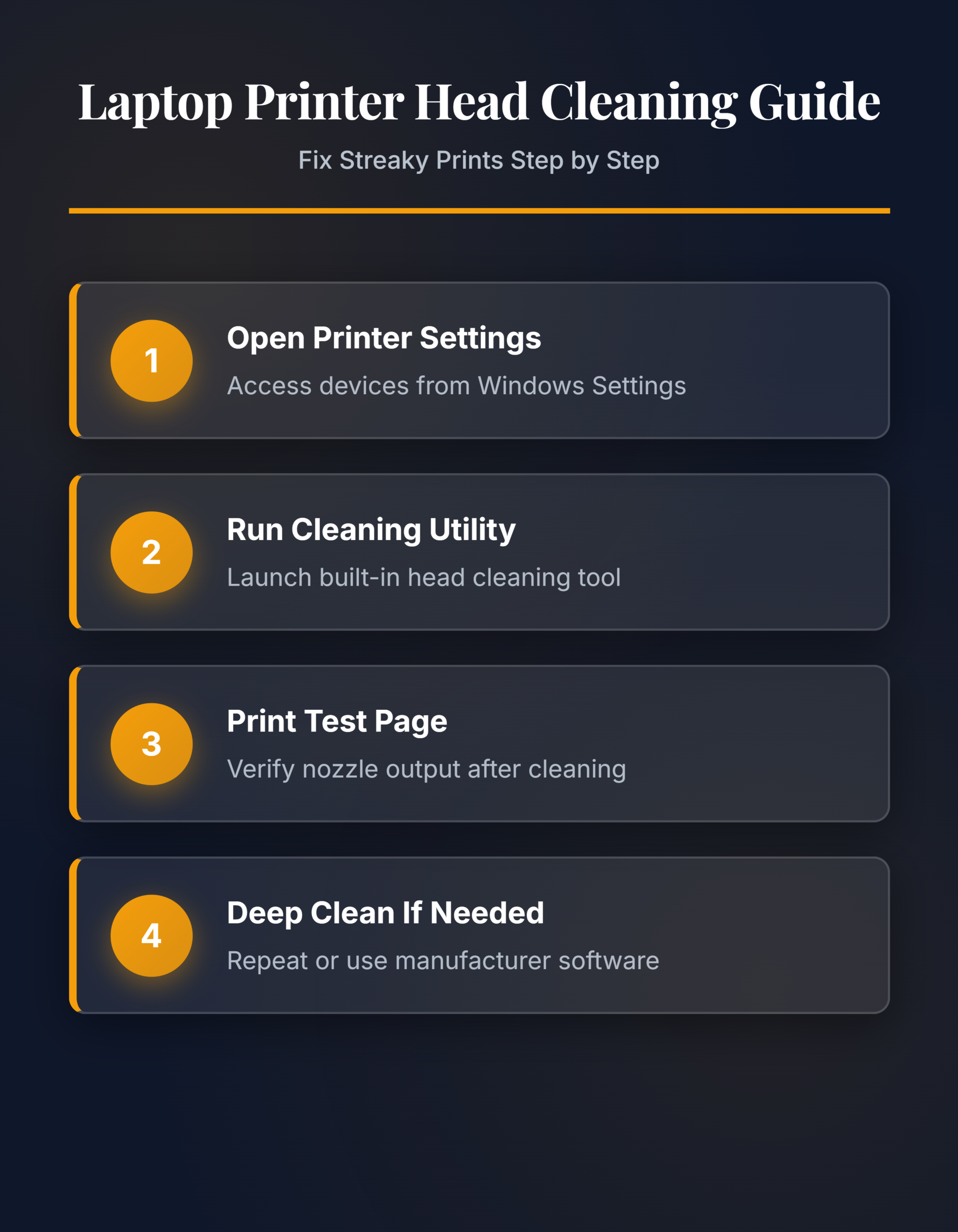 Streaky documents and missing colors usually point to clogged printer nozzles rather than empty ink cartridges. Running a print head cleaning cycle directly from your laptop restores output quality without removing any hardware. You will use built-in Windows printer utilities and manufacturer software to clear dried ink from the nozzle plate and verify that every color channel fires correctly.