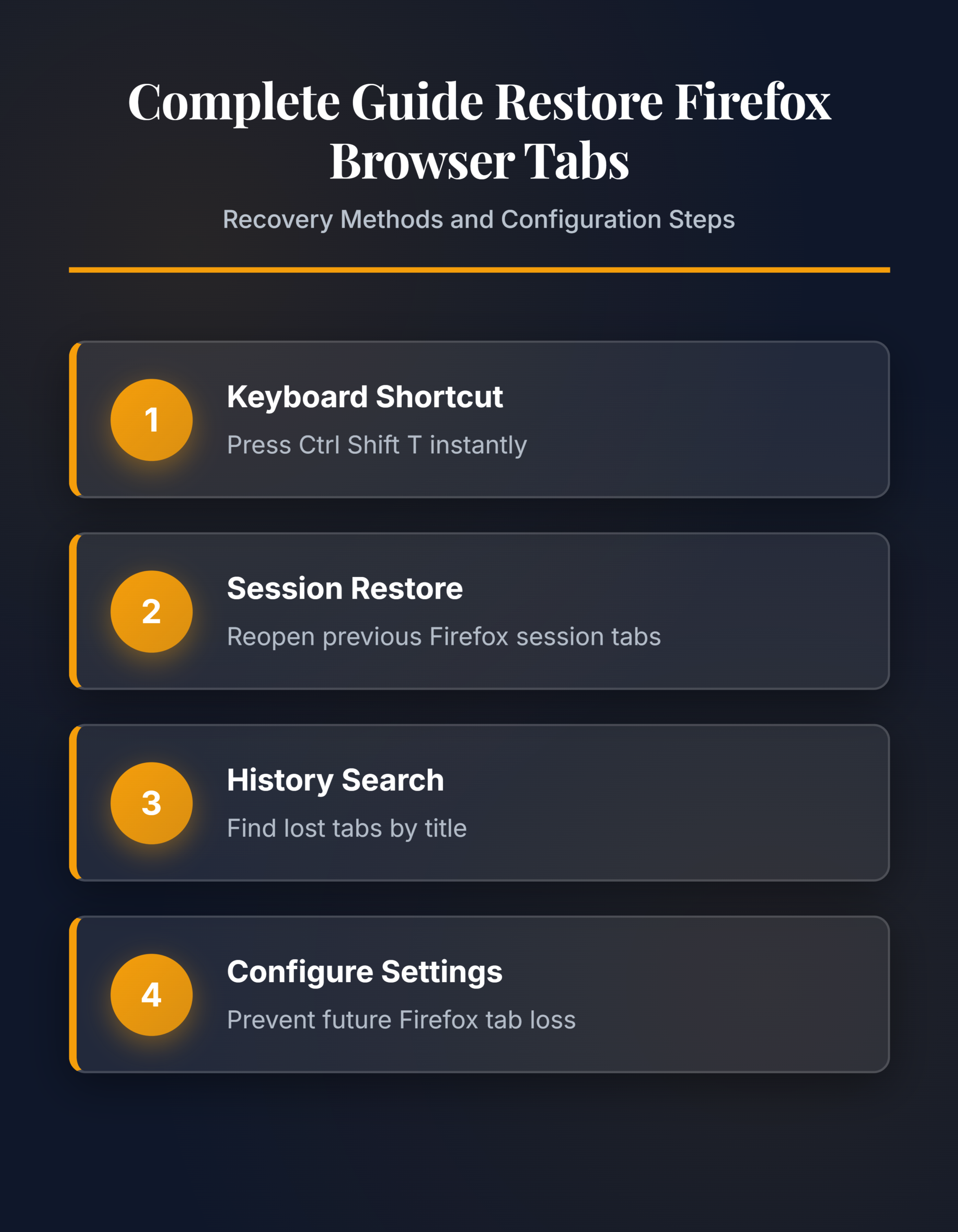 Losing browser tabs mid-research or during a project wastes time and breaks your workflow. Firefox stores session data and browsing history locally, which means most closed tabs are recoverable within minutes. This guide walks through every method to restore Firefox tabs, from quick keyboard shortcuts to deep session restore configuration changes that prevent tab loss permanently.