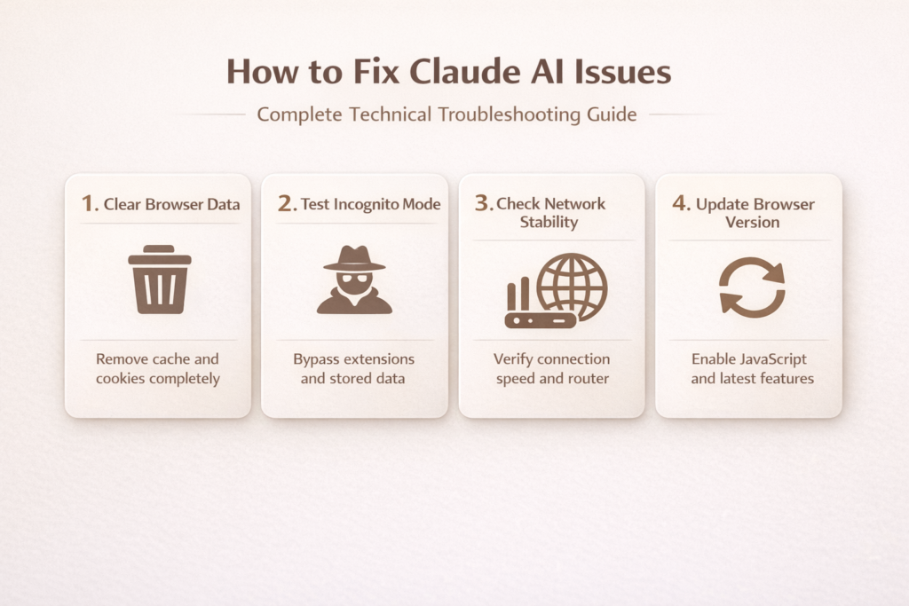 When Claude stops responding, refresh the page first, then clear your browser cache. Break complex prompts into smaller parts and avoid uploading large files during peak hours. Authentication problems require logging out and back in.