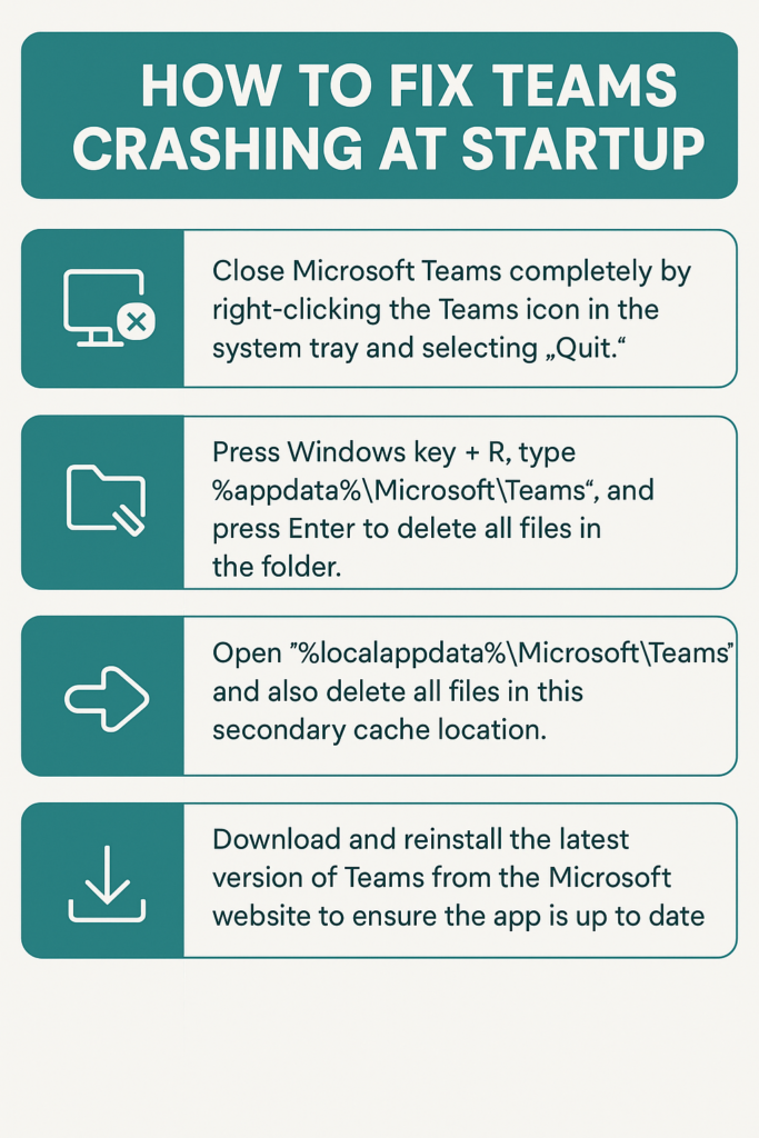 - Teams crashes immediately after clicking the desktop icon: This typically indicates corrupted user profile data or conflicting startup programs running simultaneously with Teams. Clear the Teams cache completely, then disable unnecessary startup programs through Task Manager’s Startup tab. Restart your computer and launch Teams as the first application to isolate potential conflicts with other software.