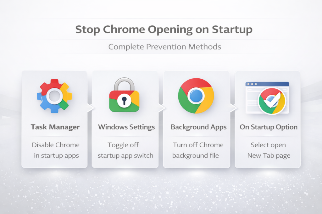 Chrome opening automatically every time you start your computer can slow down your boot process and consume system resources before you even begin working on your daily tasks. Several different settings across both Windows and Chrome itself can trigger this automatic launch behavior, including startup program entries, background app permissions, and browser session restore configurations. This article covers every method available to stop Chrome from opening on startup, so you can regain full control over which applications launch when your computer boots up.
