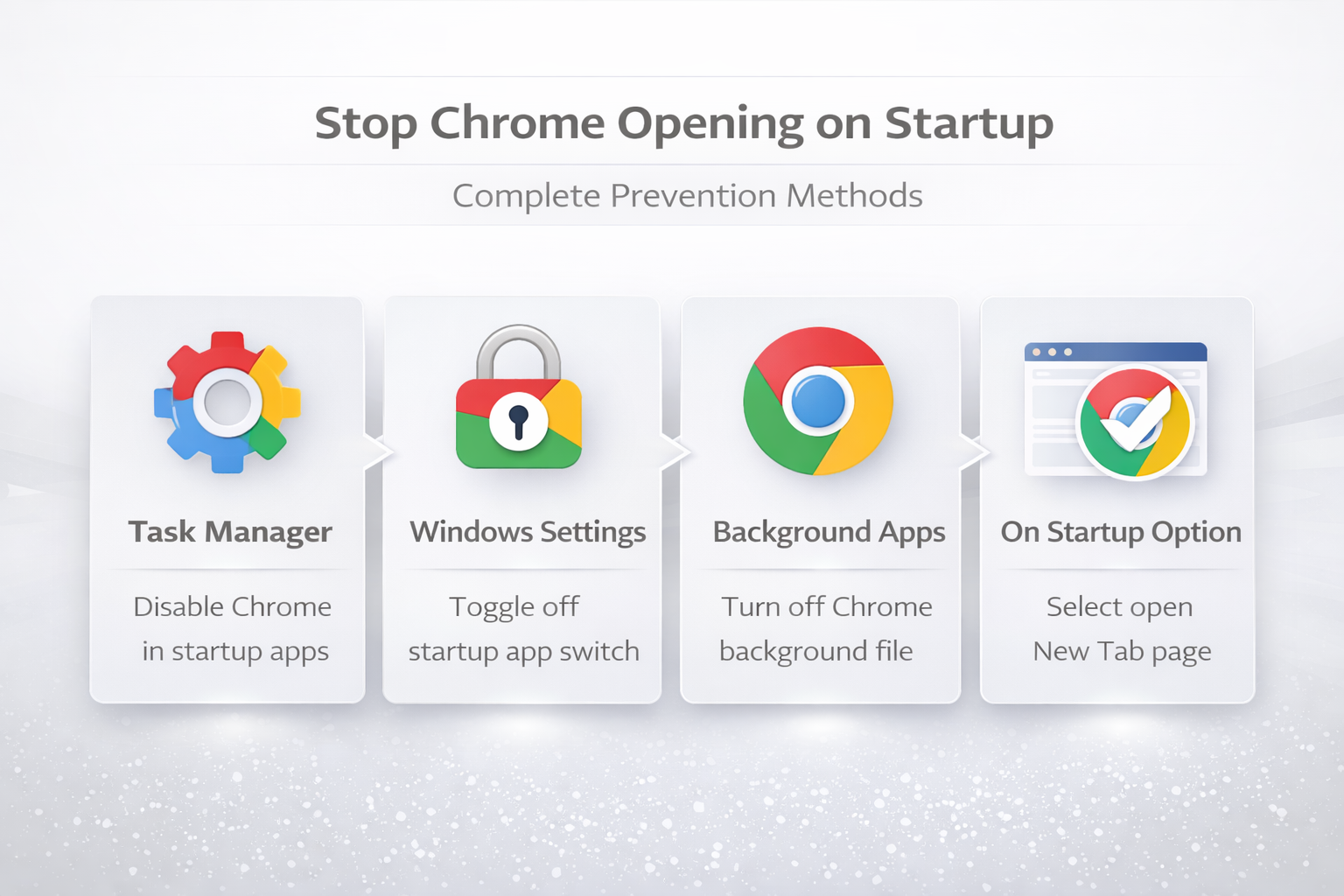 Stopping Chrome from opening on startup requires checking multiple locations across both Windows system settings and Chrome browser settings to ensure all automatic launch triggers are properly disabled. The most effective approach combines disabling Chrome in the Windows Task Manager startup tab, turning off Chrome background apps through the browser System settings, and selecting the New Tab page startup option. Following these three steps together guarantees that Chrome will only open when you explicitly choose to launch it, giving you complete control over your startup experience and overall system performance.