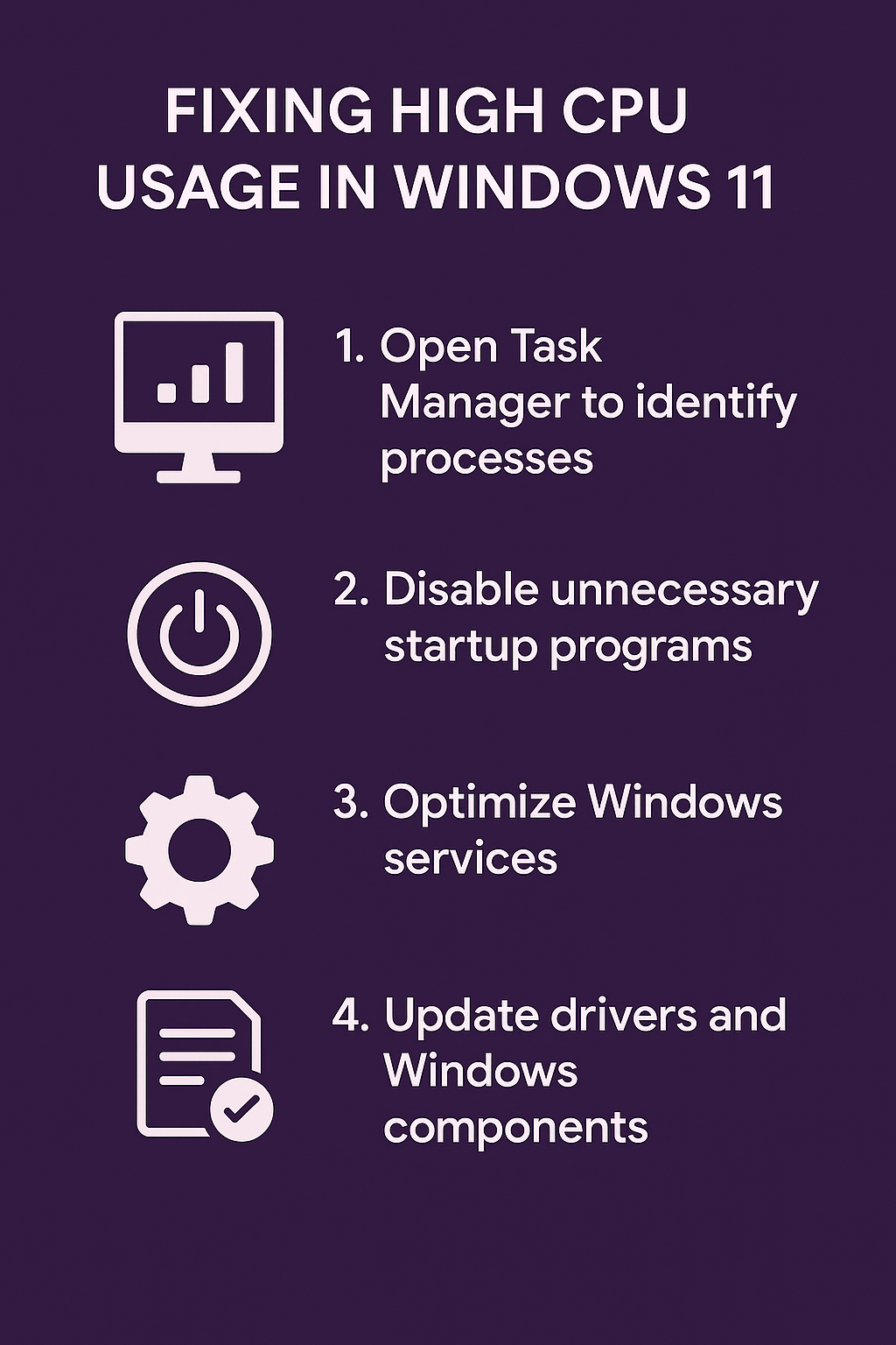 High CPU usage in Windows 11 occurs when your processor runs at 80–100% capacity for extended periods, often leading to lag, excessive fan noise, and possible overheating. It can be triggered by background applications, system updates, malware, outdated drivers, or processes that fail to shut down properly. If ignored, it can seriously impact performance and even reduce your computer’s lifespan.
