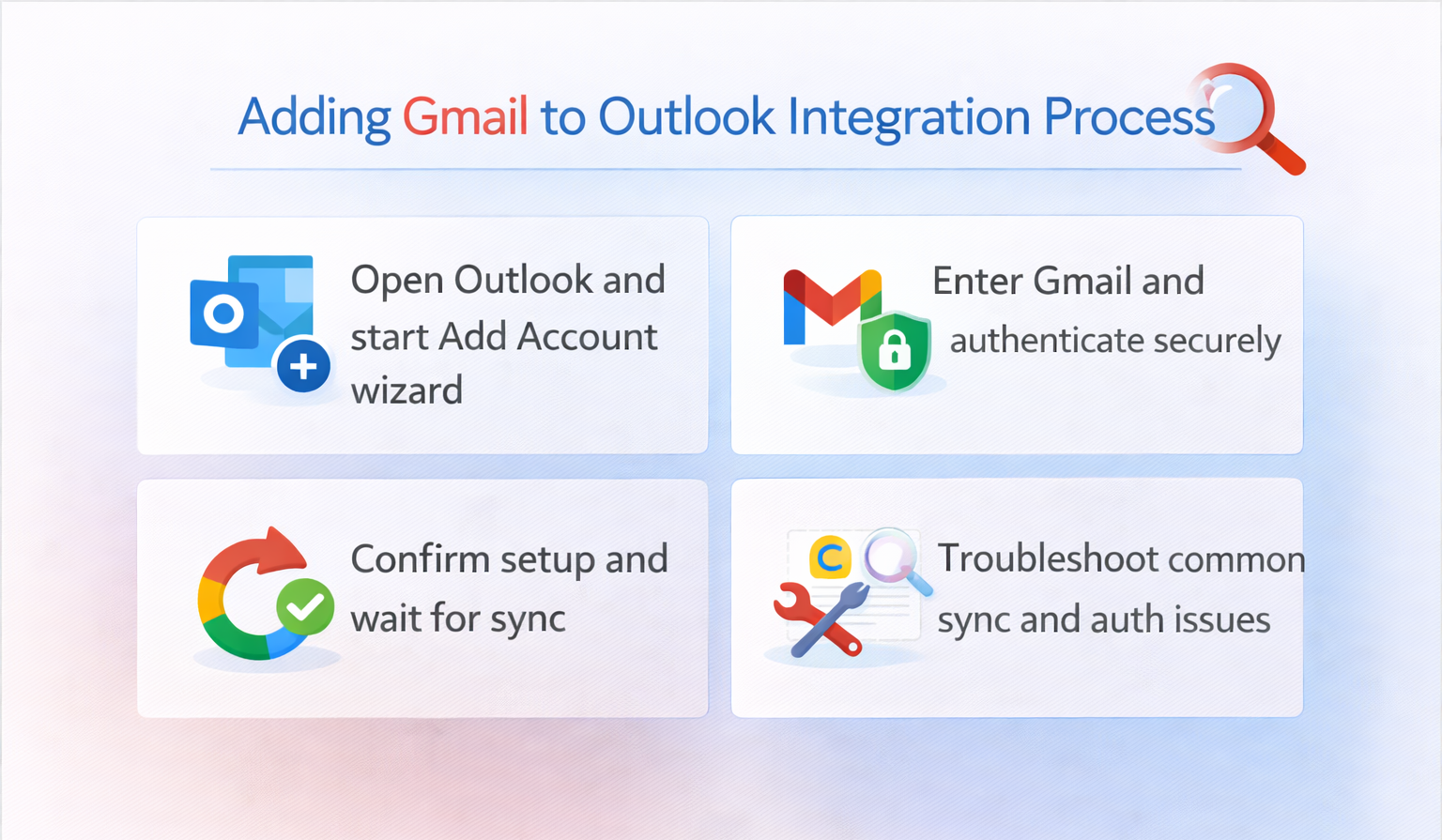 Several technical challenges can prevent successful Gmail account integration with Outlook, requiring specific troubleshooting approaches to resolve authentication and synchronization problems.