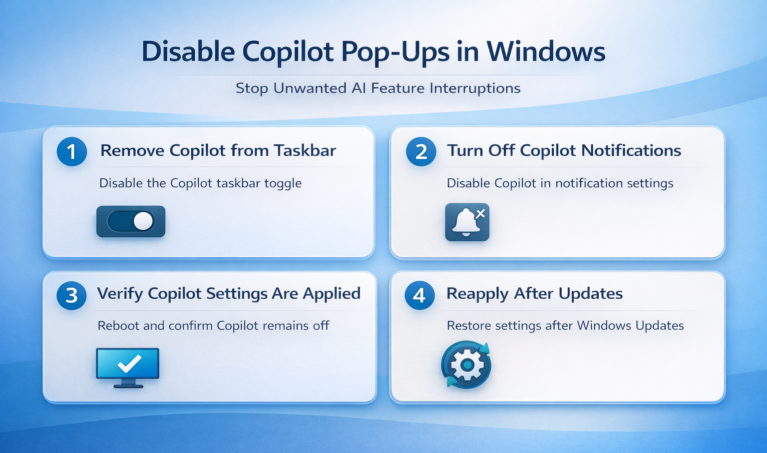 Stopping Copilot pop-ups requires changes at the Windows system level, the Edge browser level, and within notification settings. Apply the Group Policy method for the most permanent fix, and recheck your configuration after major Windows updates to maintain an interruption-free workspace.