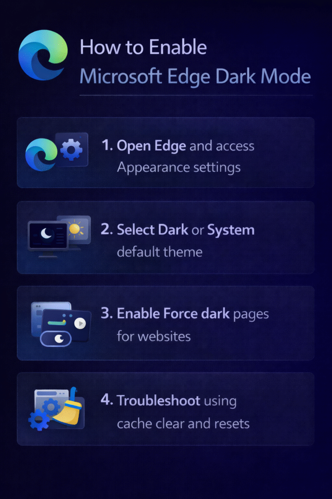 The workflow covers accessing Edge settings, configuring theme preferences, adjusting webpage display options, and managing dark mode behavior across synchronized devices. Prerequisites include having Microsoft Edge installed on your device with administrator privileges for system-level theme changes. We will explore both automatic and manual dark mode activation methods, ensuring compatibility with Windows system preferences and mobile device settings.