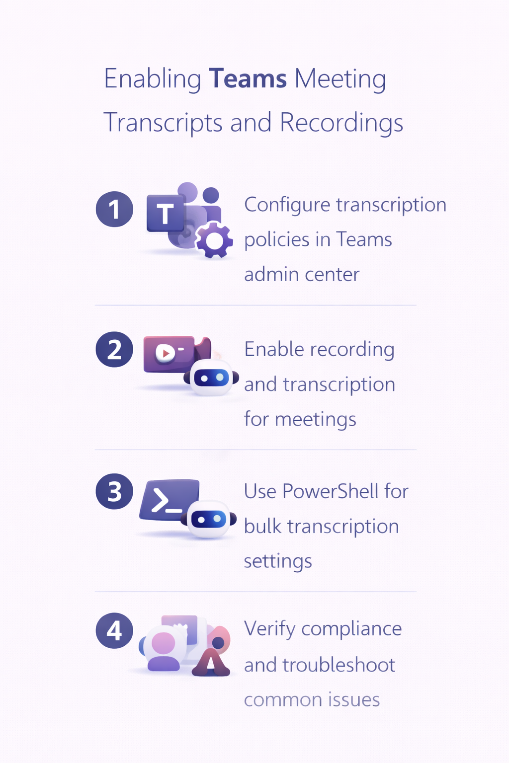 - Review tenant-specific settings for transcript storage location and access permissions to ensure compliance with industry regulations and organizational data governance requirements for meeting documentation.