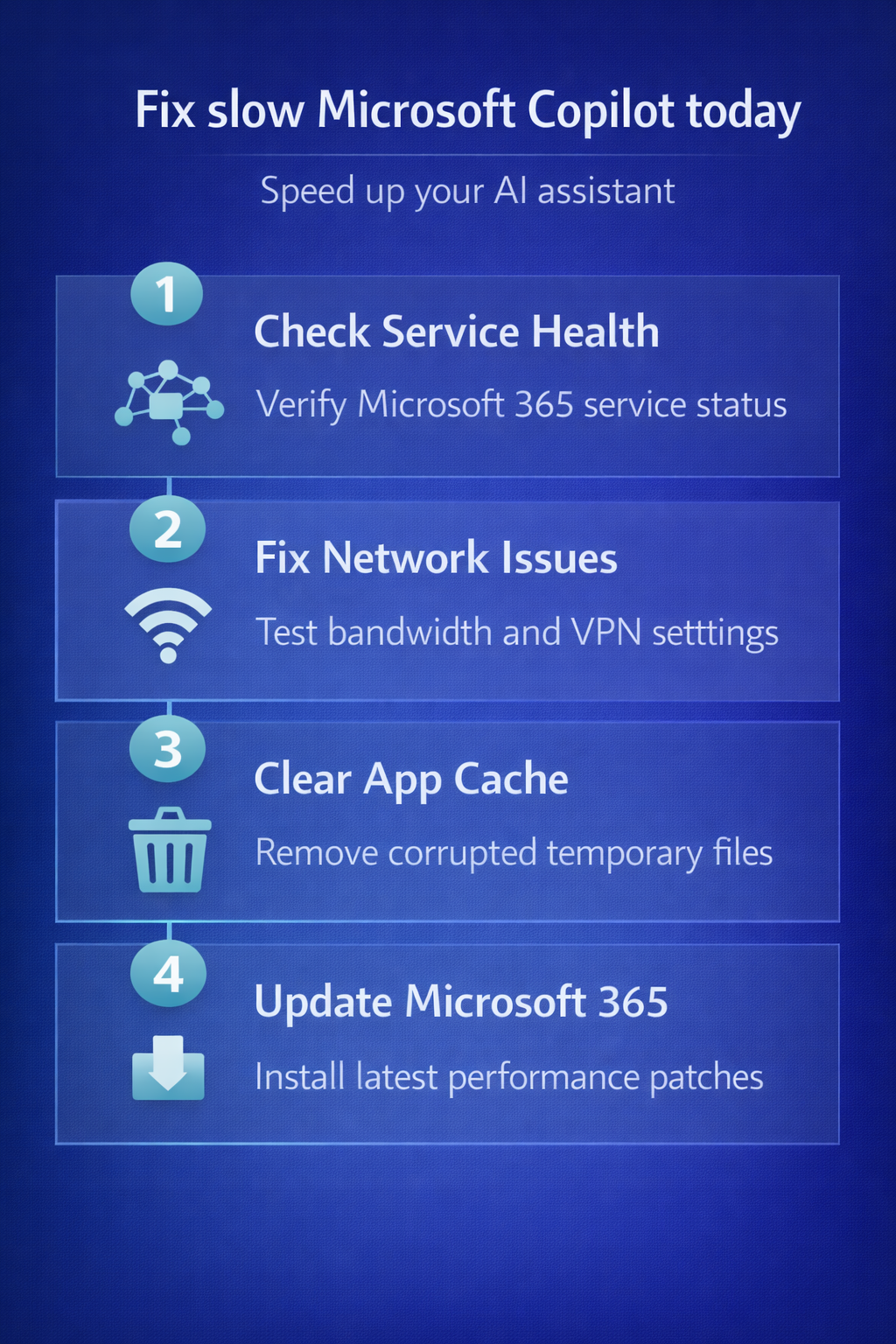Microsoft Copilot becomes slow due to server-side outages, network connectivity problems, outdated application versions, or corrupted cache files that degrade communication with Microsoft cloud services. Checking service health status, clearing your application cache, updating to the latest Microsoft 365 version, and optimizing your network connection are the most effective steps to fix slow Copilot. For cases where Copilot freezes completely, our walkthrough to fix Microsoft Copilot not responding covers additional recovery methods.