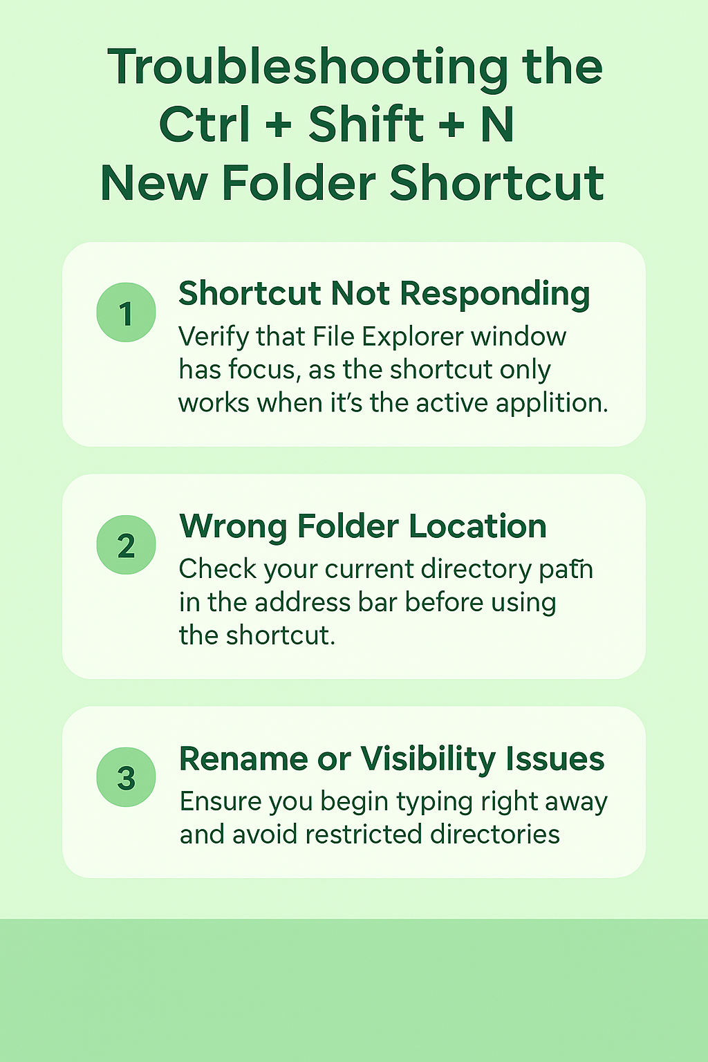 - Ctrl + Shift + N shortcut not responding: Verify that File Explorer window has focus by clicking inside the window area, as the shortcut only works when File Explorer is the active application receiving keyboard input.